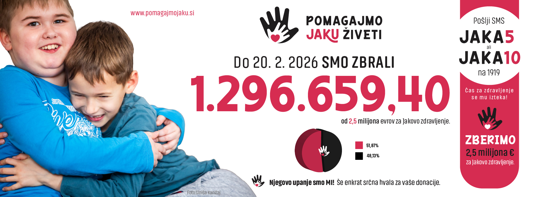 Pošljite JAKA5 ali JAKA10 na 1919 in prispevajte prek SMS-a ali na vseh zgoraj naštetih možnostih donacije.